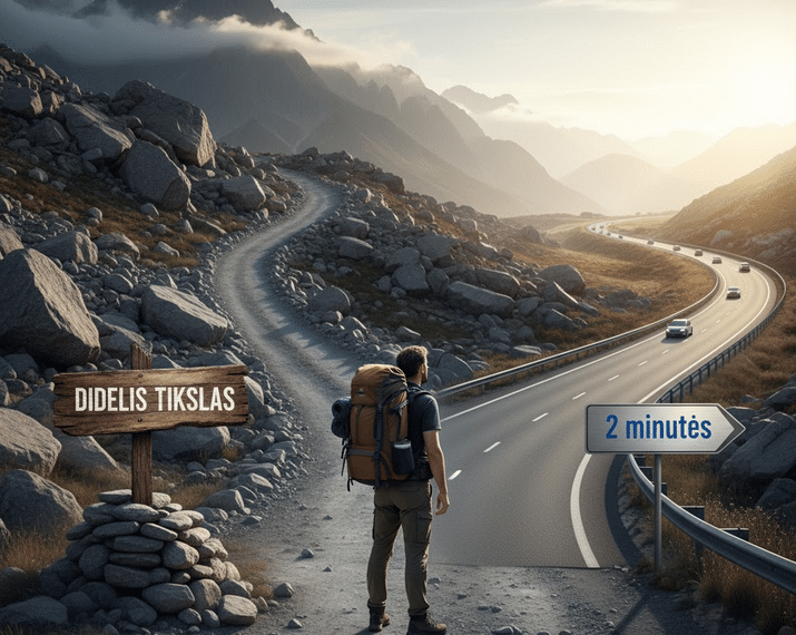 Jei vidinis balsas sako, kad tai tik kvailas triukas, ir Jūs juk žinote, kad tikrasis tikslas yra didesnis, išbandykite štai ką: atlikite veiksmą dvi minutes ir sustokite.