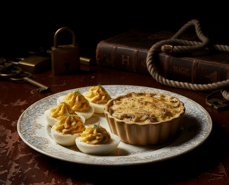 Houdini receptas – tai įdaryti kiaušiniai ir užkeptos grybų kepurėlės. Abu patiekalai reikalauja kantrybės ir tikslumo: kiaušinius reikia išvirti idealiai, trynius sutrinti į vientisą masę, o tada dailiai įdaryti atgal į baltymus. Grybus reikia kruopščiai paruošti, sluoksniuoti ir apkepti. Tai ne chaotiškas mėsos kepimas ant laužo, o labiau primena sudėtingo mechanizmo surinkimą. Tai – jo pabėgimo menas, perkeltas į lėkštę.