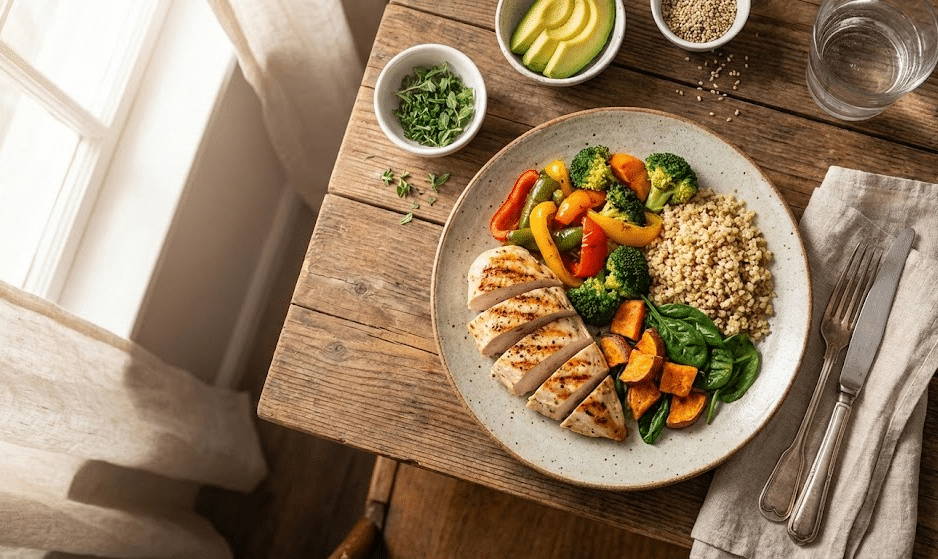 1. Baltymų prioritetas: Kiekvieną valgį pradėkite nuo baltymų (kiaušinių, žuvies, paukštienos, ankštinių, varškės). Jūsų tikslas – bent 30–40 g baltymų per vieną valgymą.