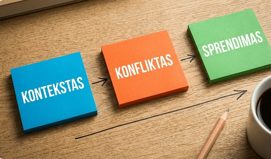 Jums nereikia rašyti romano. Norint papasakoti įtaigią istoriją susirinkime ar prie vakarienės stalo, užtenka trijų elementų: Kontekstas – Konfliktas – Sprendimas.