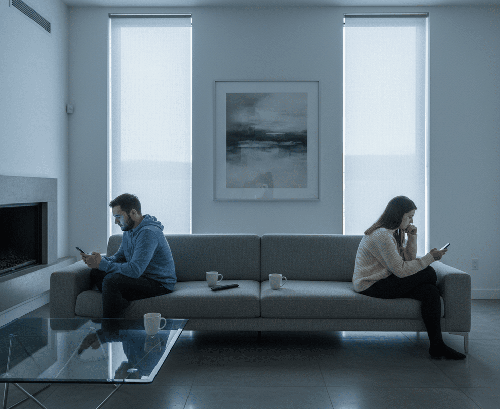 pora sėdi skirtingose sofos pusėse emociškai atitolę