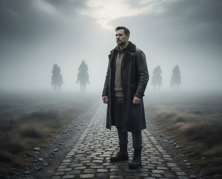 vyras stovi vidury kelio už jo keturi mirties raiteliai