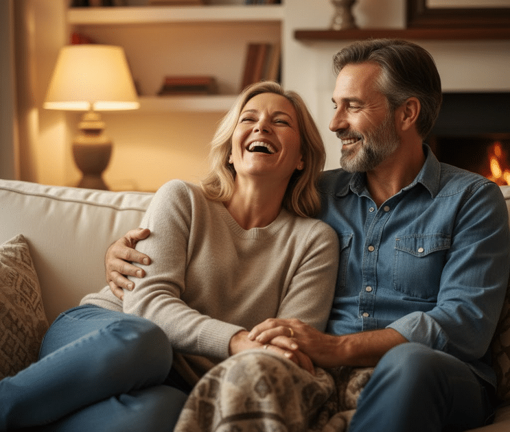 vidutinio amžiaus pora sėdi ant sovas ir linksmai bendrauja