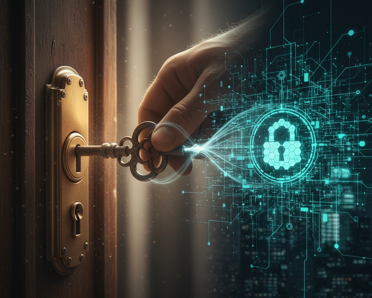 Skaitmeniniame pasaulyje principas identiškas. Jūsų slaptažodis yra lygiai tokia pati slapta informacija, kaip ir Jūsų rakto dantukai. Kai bandote prisijungti prie savo el. pašto, sistema klausia to paties: „Ar Jūs turite teisingą informaciją, kad atrakintumėte šias duris?“