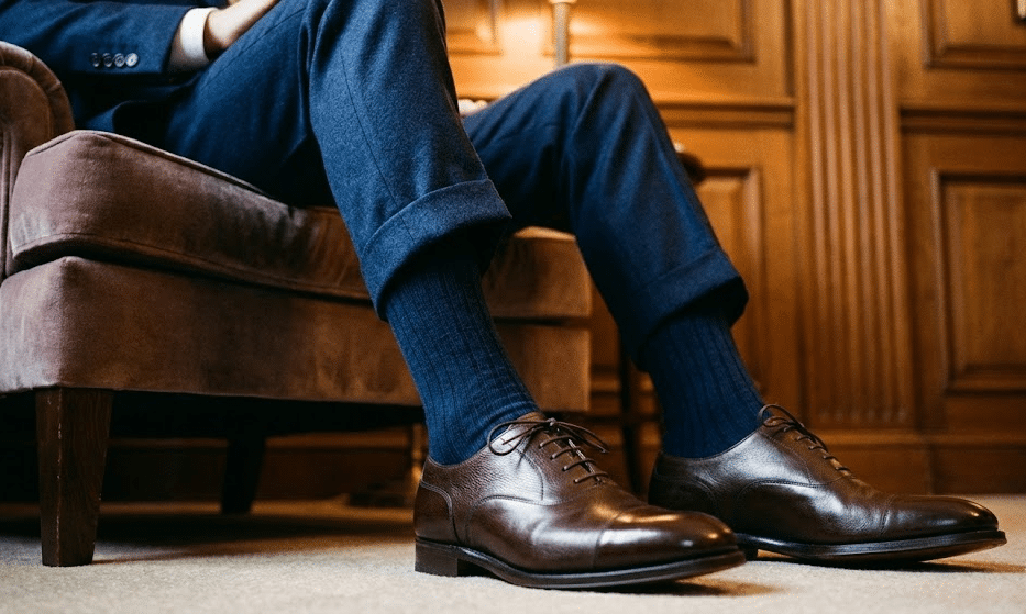 - Jei kojinės atitinka kelnių spalvą (pvz., tamsiai mėlynos kojinės prie tamsiai mėlyno kostiumo), jos vizualiai prailgina kojos liniją iki pat žemės. Tai suteikia ūgio ir elegancijos.