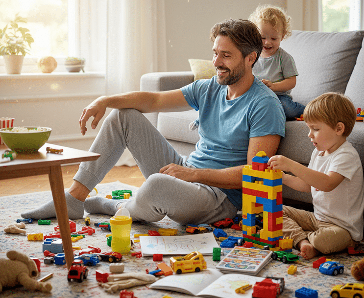 laimingas tėtis su vaikais sėdi ant grindų tarp žaislų